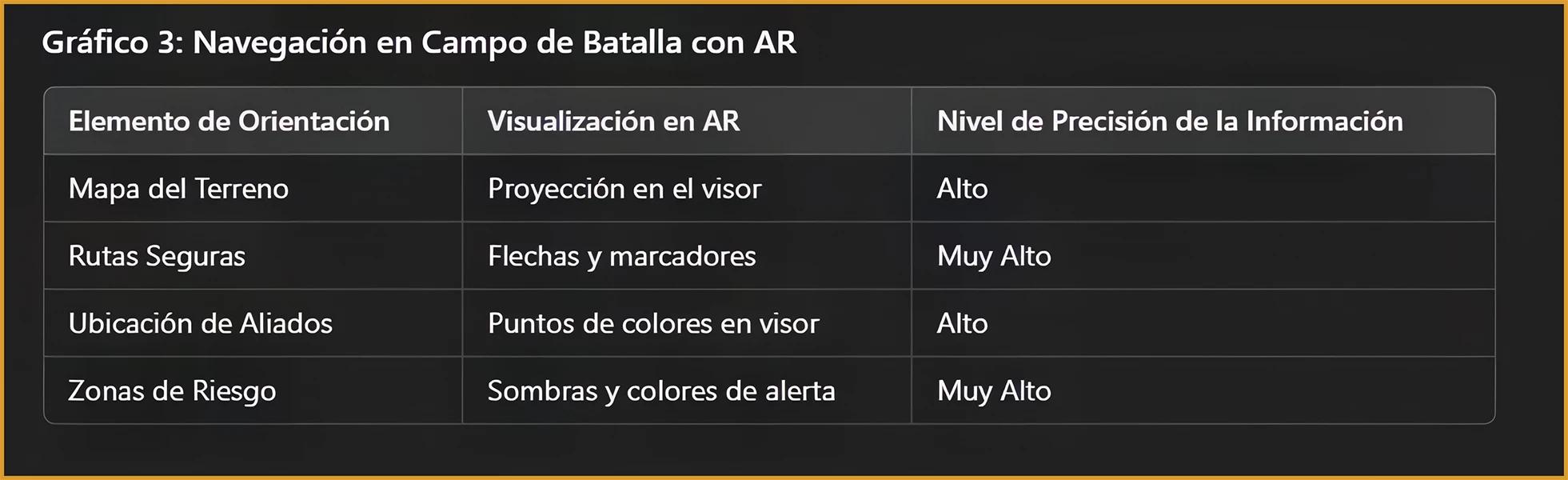 La realidad aumentada también se usa para ayudar a los soldados a navegar en terrenos desconocidos. Durante una misión, un soldado puede usar un dispositivo de AR que proyecta sobre su visor mapas, rutas seguras, ubicaciones de aliados y áreas de riesgo. Esto es especialmente útil en entornos urbanos o en operaciones de rescate donde la rapidez y precisión de la orientación son cruciales.
